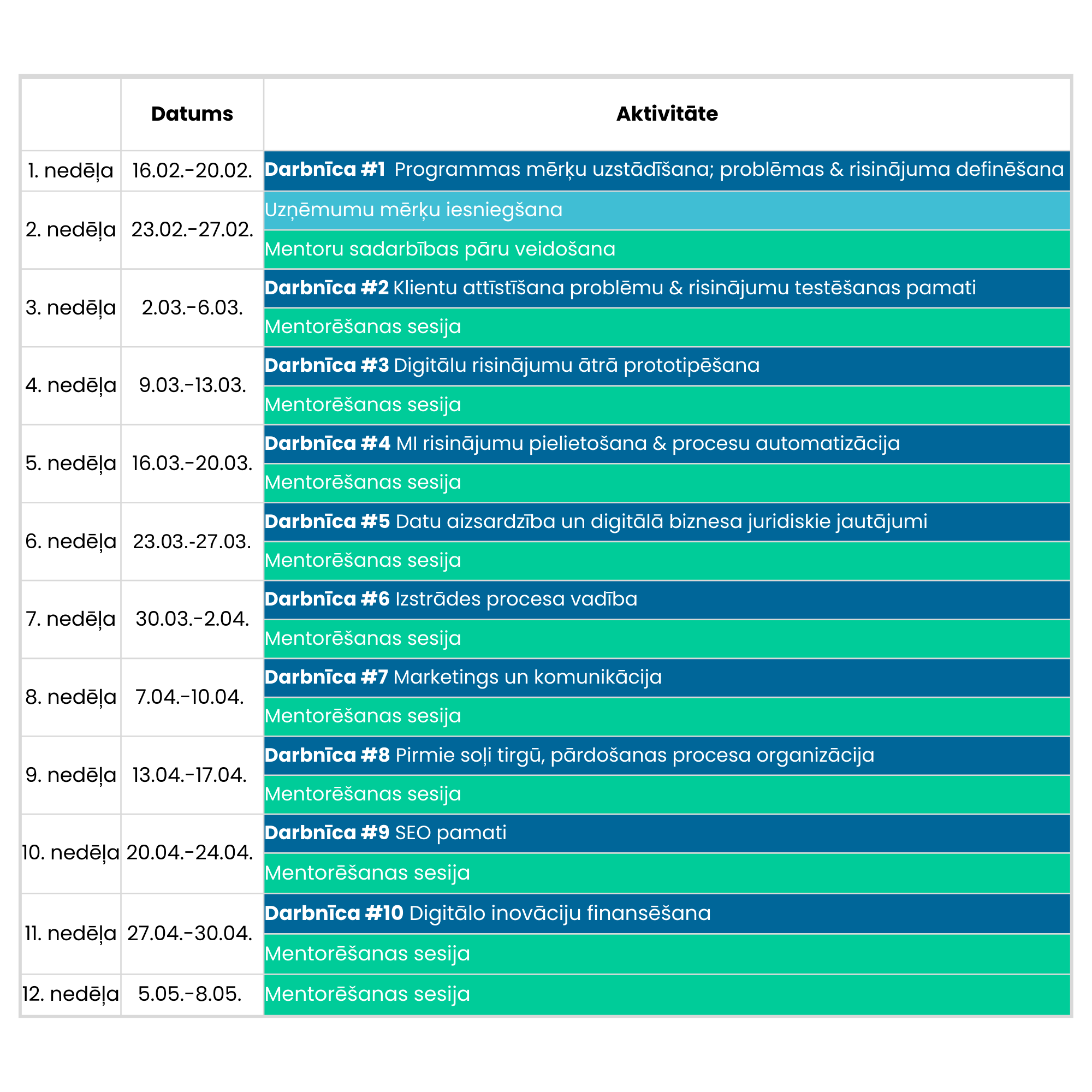 Darbnīcas notiks pirmdienās, no plkst. 14.00 līdz 17.00 (grafikā iespējamas izmaiņas).